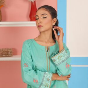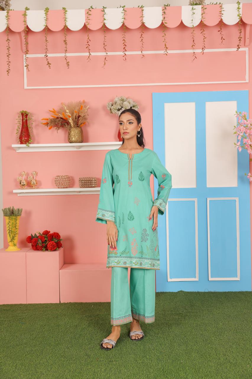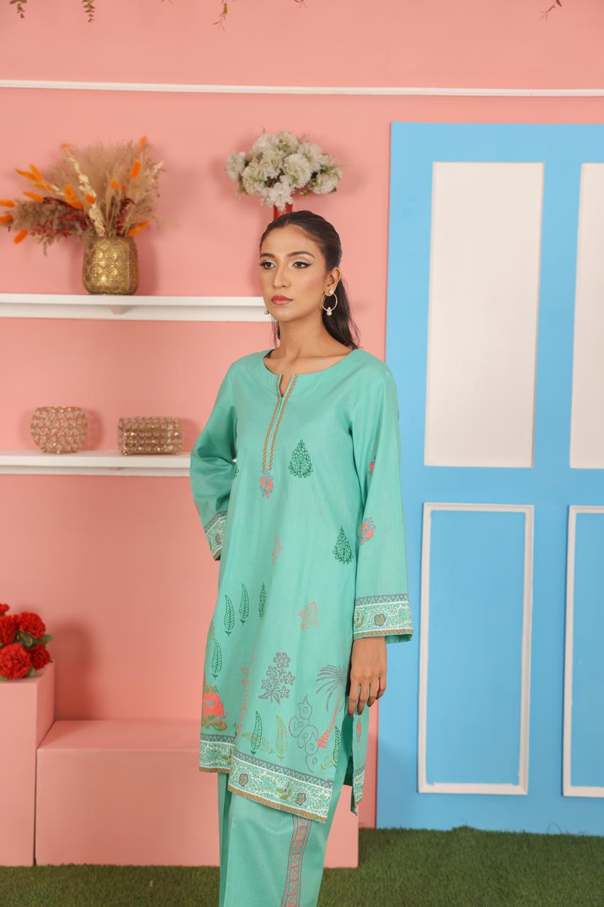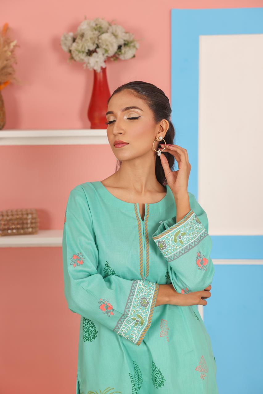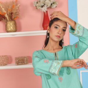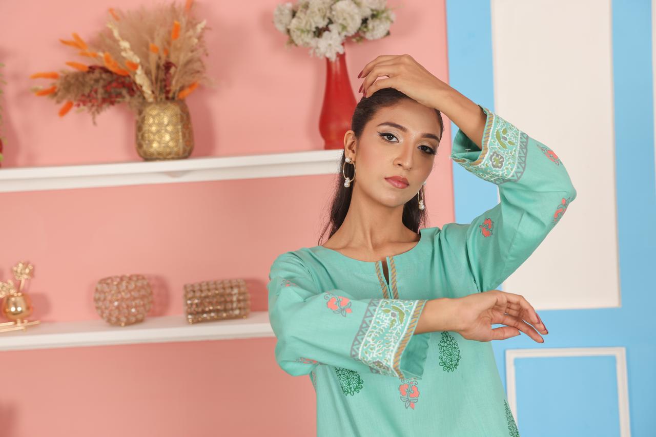 This aqua green 2-piece outfit features a straight-cut kurta with traditional block printed motifs and intricate borders on the sleeves and hem. The soft, breathable fabric ensures all-day comfort, while the matching straight pants complete the coordinated look. Ideal for casual wear, festive occasions, or everyday outings, this set offers a classic design with a touch of handcrafted detail.