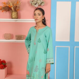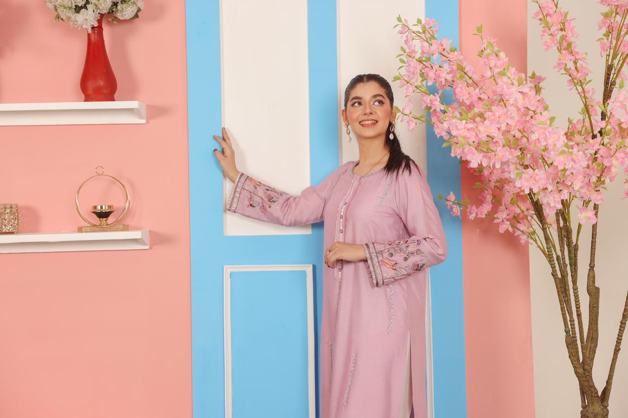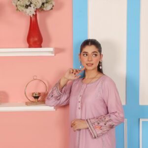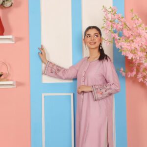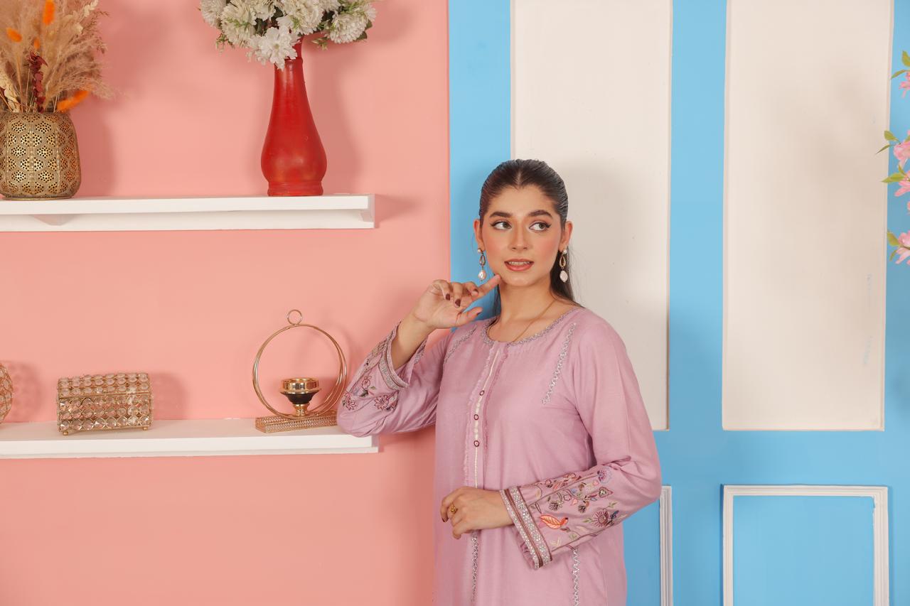 This two-piece outfit includes a straight-cut shirt in soft mauve cotton net, paired with an off-white trouser. The shirt features subtle stone embellishments on the front and detailed resham hand embroidery around the neckline and sleeves. The embroidery is done in elegant pastel shades of peach, ivory, and light green, complementing the soft mauve tone of the shirt. The off-white trousers are enhanced with intricate embroidery and cutwork on the hem for a refined finish. Perfect for daytime gatherings or light festive occasions.