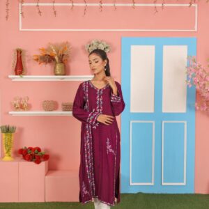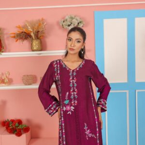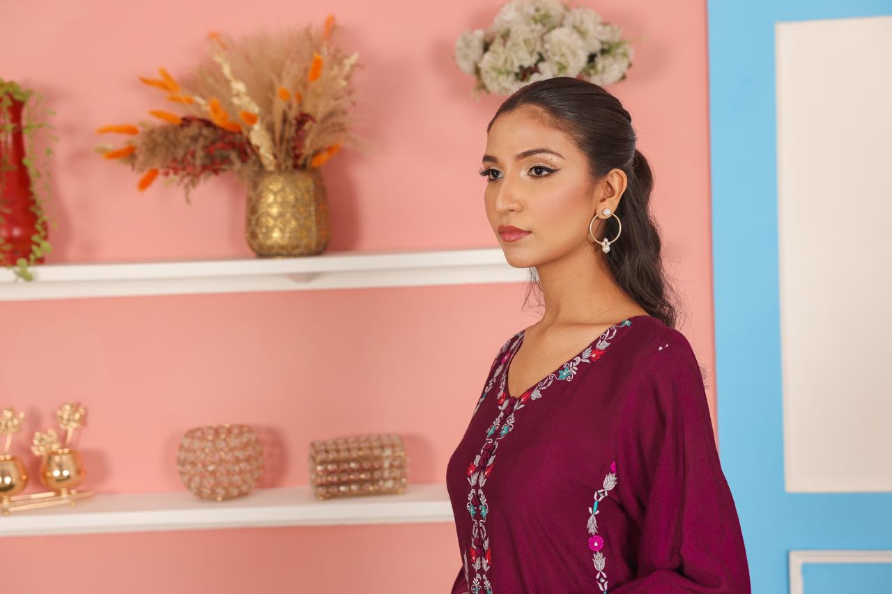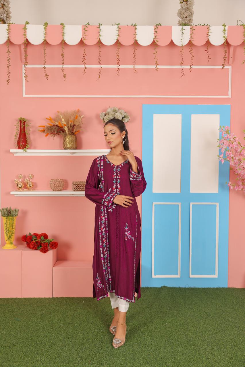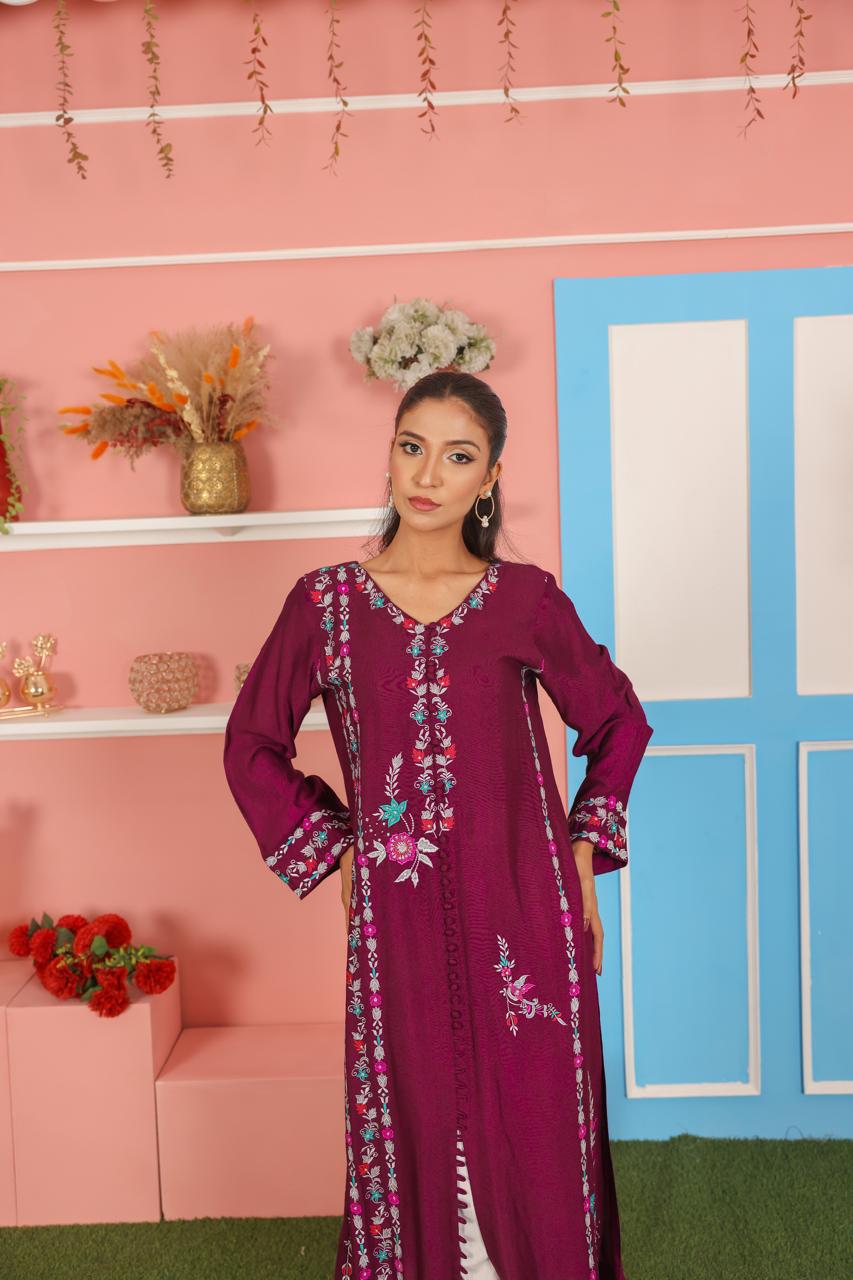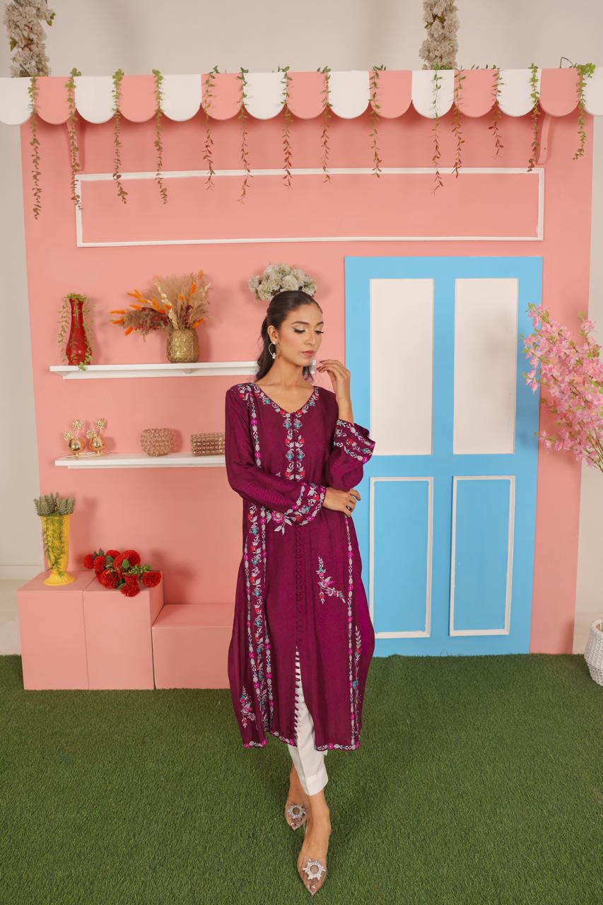 Crafted from breathable cotton net fabric, this plum purple kurta features delicate thread embroidery that adds charm and elegance to the overall look. The front panel, sleeves, and hemline are detailed with intricate floral embroidery in soft shades of baby pink, sky blue, and white, creating a beautiful contrast against the rich purple base. The straight silhouette with side slits ensures comfort and style for both festive and casual occasions.