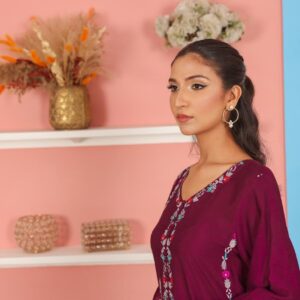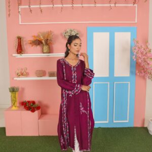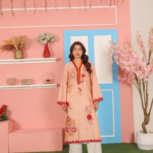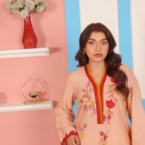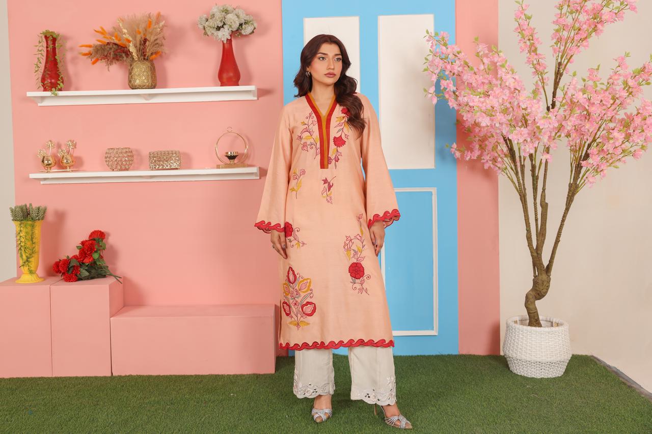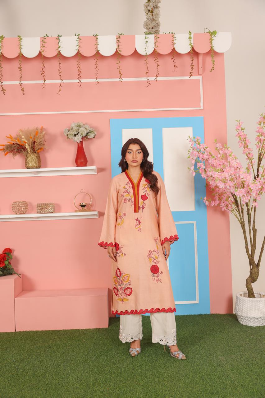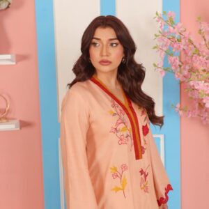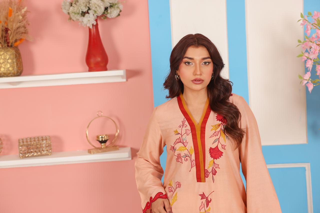 A vibrant and artistic 2-piece suit crafted in premium cotton net fabric. The peach-colored shirt features a striking V-slit neckline outlined in deep maroon and rust red, giving it a bold yet graceful finish. The front is adorned with floral embroidery in vivid hues of red, yellow, mustard, rust, and soft pink, artistically scattered along the shirt front and sleeves. The hemline and sleeves are finished with decorative scalloped edging in a matching deep red for added character.
