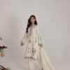 The outfit is paired with off-white trousers, delicately embroidered with cutwork at the hem, adding a touch of sophistication and balance to the colorful shirt.